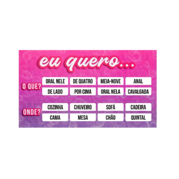 Neste jogo vale tudo inclusive ariscar novas experiencias, você e seu parceiro(a) vão adorar e criar vários situações inusitadas, as quais vão ampliar ainda mais o desejo de um pelo outro.